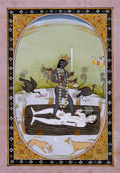 La salita durò svariate ore ed in una delle soste ebbi il darshan (visione) che segue a guidarmi nella mia vita. E stavolta parlo proprio dell’incontro con un quadro, un’immagine materiale ma unica, l’unica che ho visto pur continuandone a cercare una copia da allora, invano. Normalmente secondo la tradizionale interpretazione ci troviamo nel Kali Yuga e Šiva il dio viene rappresentato dormiente con Kali, la dea come energia distruttrice, che gli danza sopra. Dio non c’è più, dorme ma dormendo sogna Kali, la sua Shakti, energia che distrugge l’ignoranza, e con la sua spada fornita di un occhio aperto la dea taglia le teste della mente condizionata squarciando il velo di Maya, l’illusione che fa vedere diviso ciò che in realtà è unito.